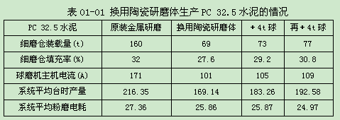 原二倉鋼球設計裝載量為160t,改裝陶瓷研磨體按設計裝載量的60%算應為96t(填充率將增大約1.2倍),按填充率不變算應裝約80t(密度小了一半),但為防止串倉起見,7月22日只裝了69t陶瓷研磨體。該廠已經配套了能源管理系統,各種粉磨參數(包括系統電耗)隨時可見,從7月23日至26日生產PC 32.5水泥的情況看,取得如下使用效果: