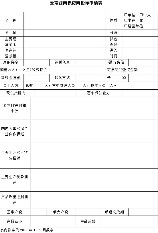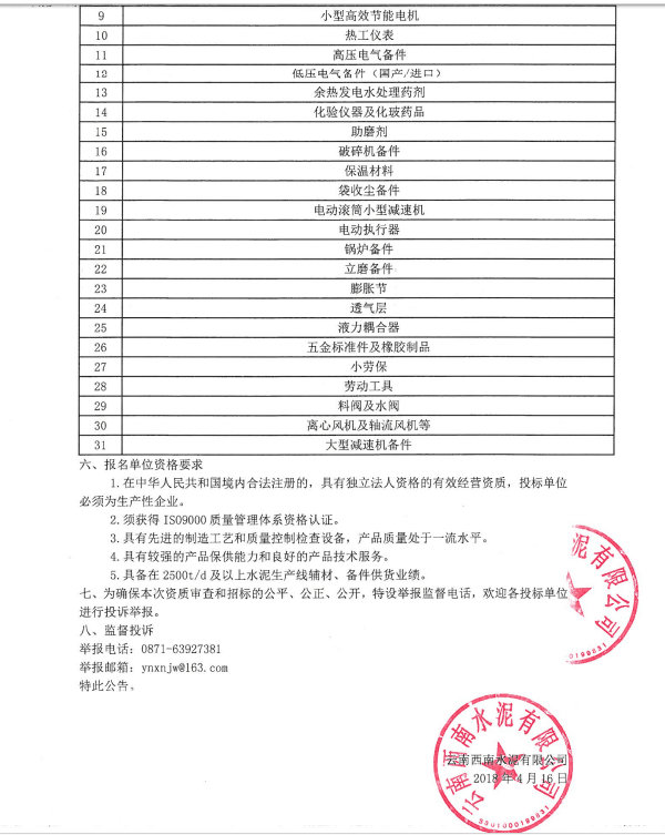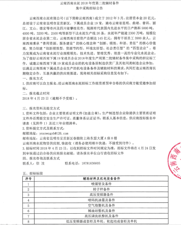 【水泥人網】云南西南水泥有限公司(以下簡稱云南西南)成立于2012年3月,注冊資本金20億元,總部設于云南省昆明市呈貢新區,下屬成員企業19家,遍布云南省昆明、曲靖、普洱、麗江、文山、德宏等市州及四川省攀枝花市,現擁有代表國內先進水平的日產熟料5000噸、4000噸、3200噸、2500噸等新型干法水泥生產線26條,水泥年產能逾2300萬噸,規模位居全省水泥企業第二位。云南西南目前資產總額達145億元,擁有干部員工3900余人。云南西南秉承“善用資源、服務建設”的核心理念和“創新、績效、和諧、責任”的核心價值觀,努力創建“創新績效型、資源節約型、環境友好型、社會責任型”的“四型企業”,著力發展成為云南省水泥行業規模領先、技術先進、管理優秀、效益一流的專業化水泥企業。為了做好云南西南下屬19家成員企業2017年度生產用第二批輔材備件集中采購的招議標工作,誠邀云南西南下屬19家成員企業的機電設備原制造供貨廠及其它同類制造企業參加,以滿足云南西南下屬成員企業生產的機電設備備件及輔助材料的需求,共同打造云南西南長期穩定合作、互惠共贏的供應商渠道?,F將相關招標采購信息發布如下: