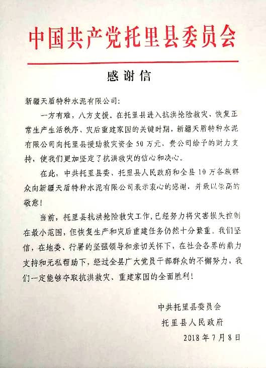 為此,中共托里縣委員會、托里縣人民政府特發函致謝,對天盾特種水泥公司在本次抗洪搶救災過程中所做的貢獻,縣委相關領導對于天盾水泥能夠從大局出發,不計企業得失的大局觀給予了高度的評價和認可。