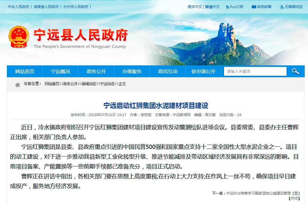 寧遠紅獅是縣委、縣政府重點引進的中國民營500強和國家重點支持十二家全國性大型水泥企業之一。項目的動工建設,對于進一步推動寧遠縣新型工業化轉型升級、推進節能減排及帶動區域經濟發展具有非常深遠的影響。目前項目備案、產能置換等一些前期手續都己準備充分,項目正式啟動。