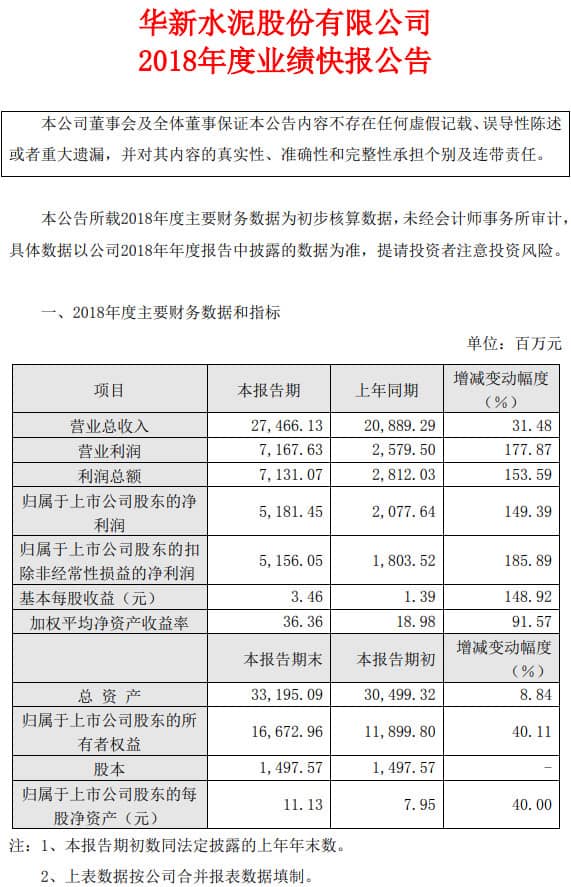 3月2日,華新水泥股份有限公司公布了2018年度快報公告,公司2018年度營業總收入274.66億元,同比增長31.48%;凈利潤51.81億元,同比增長149.39%;基本每股收益3.46元。