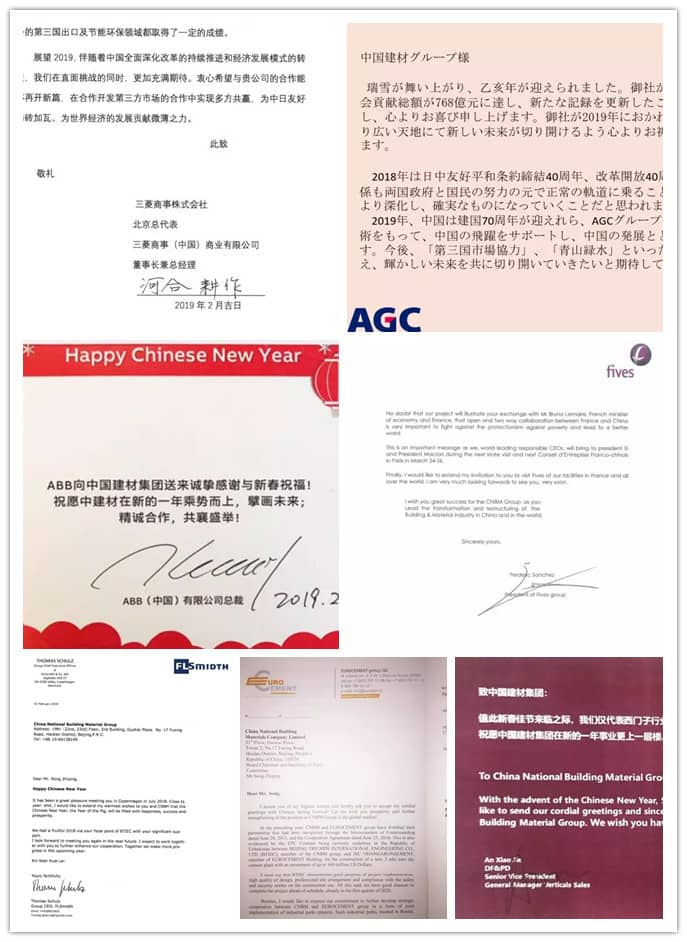 中國建材集團海外合作伙伴寄語集團2019年發展,其中既有擁有幾十年合作歷史的老朋友,也有在2018年結識的新朋友;既有基石業務持續推進中的支持者,也有三新產業開拓征途上的同行者。寄語中包含了對以往合作業績上的總結和感恩,也有對未來深入合作的思考和期待。