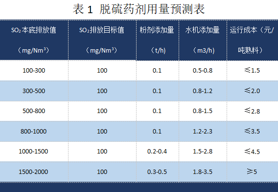 基于現場實際情況,多方面因素考慮,最終采用高效復合脫硫系統。該方案具有效果顯著、自動化控制,計量精確等優點。同時,考慮后期排堿需要,可以自行定期外排高硫高堿窯灰。