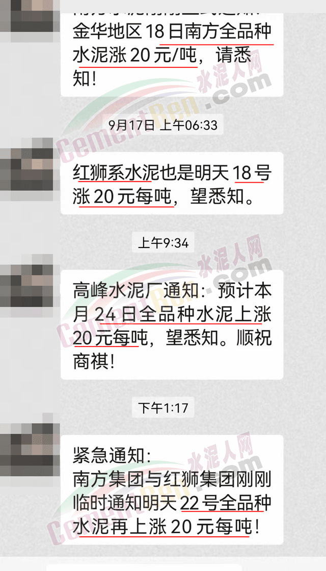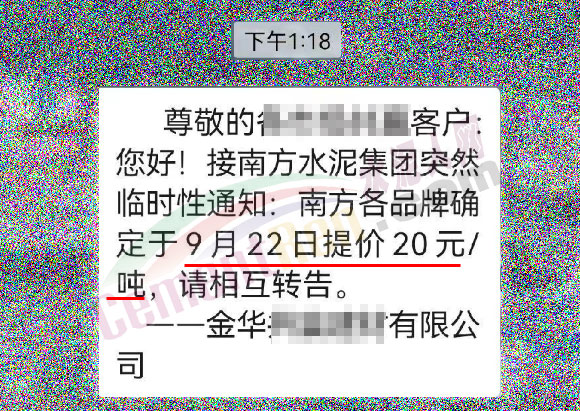 水泥人網通訊員消息,21日下午金華區域經銷商收到通知,紅獅水泥、南方水泥通知自22日起水泥價格上調20元/噸。據了解,區域內紅獅水泥、南方水泥曾于18日上調水泥價格20元/噸,兩次累計上調40元/噸。