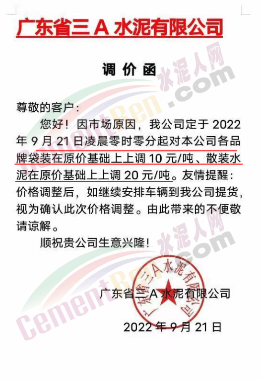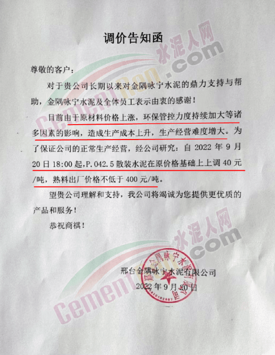同期,河北多地主要品牌企業通知再次上調水泥價格。邢臺金隅詠寧水泥通知目前由于原材料價格上漲,環保管控力度持續加大等諸多因素的影響,造成生產成本上升,生產經營難度增大。為了保證公司的正常生產經營,經公司研究,自2022年9月20日18∶00起,P.O42.5散裝水泥在原價格基礎上上調40元/噸,熟料出廠價格不低于400元/噸。