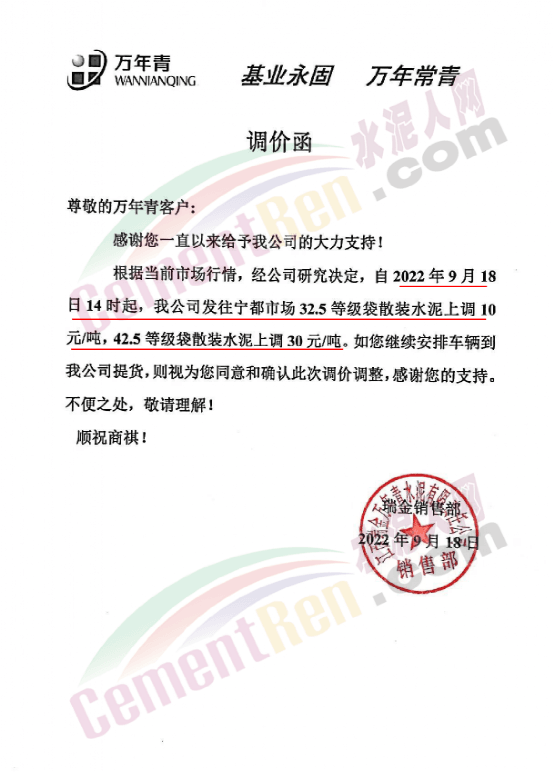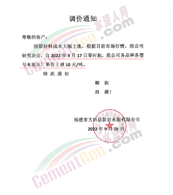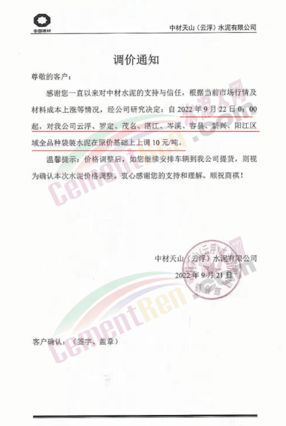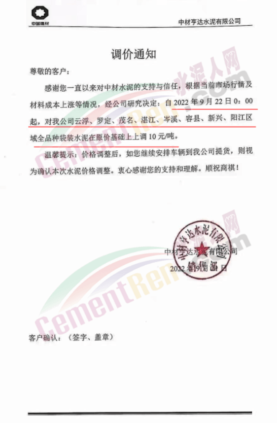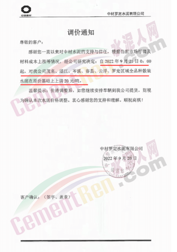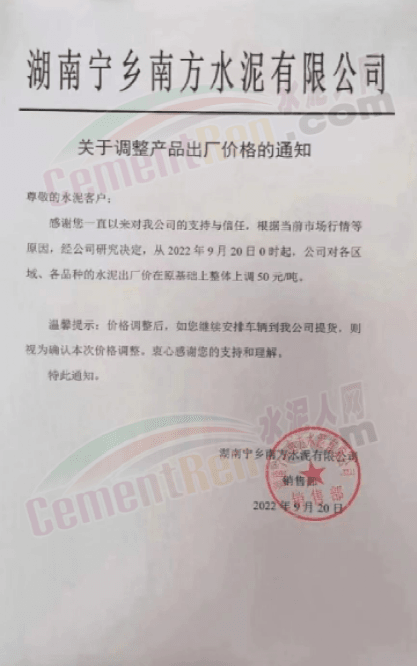 武安新峰水泥通知,受國家環境保護治理影響,原材料價格和運輸成本直線上漲,鑒于目前的市場行情,公司P.O42.5水泥從2022年9月21日8∶00起訂單辦理單價在原基礎上上調30元。