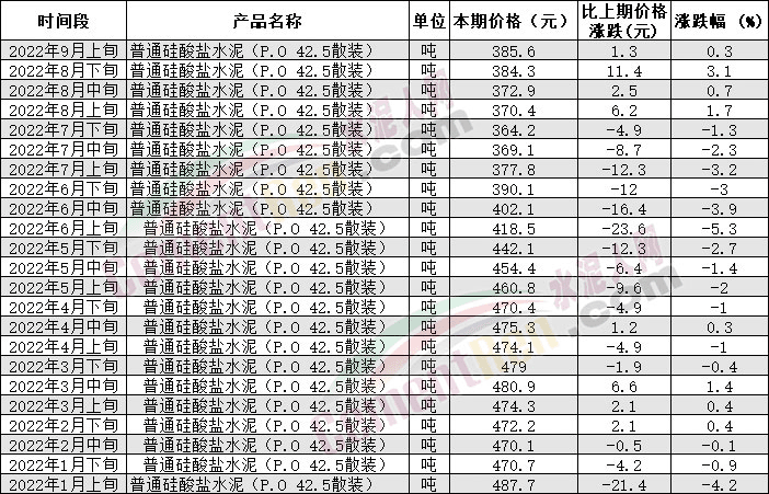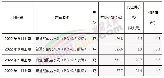國家統計局數據顯示,今年1月上旬至9月上旬,流通領域普通硅酸鹽水泥(P.O 42.5散裝)價格下跌了102.1元/噸,普通硅酸鹽水泥(P.O 42.5袋裝)價格下跌了101.3元/噸,均超過100元/噸。