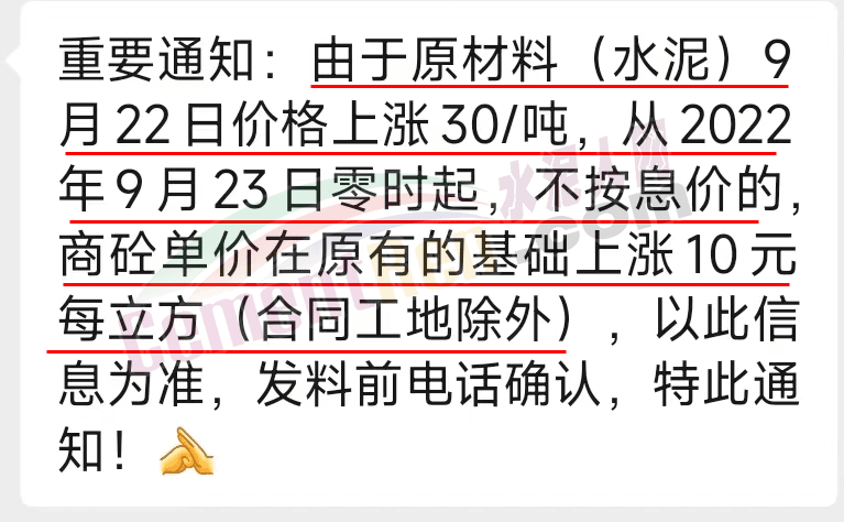 同時,下游商砼企業發重要通知稱,由于原材料(水泥)9月22日價格上漲30/噸,從2022年9月23日零時起,不按息價的,商砼單價在原有的基礎上漲10元每立方(合同工地除外), 發料前電話確認 。
