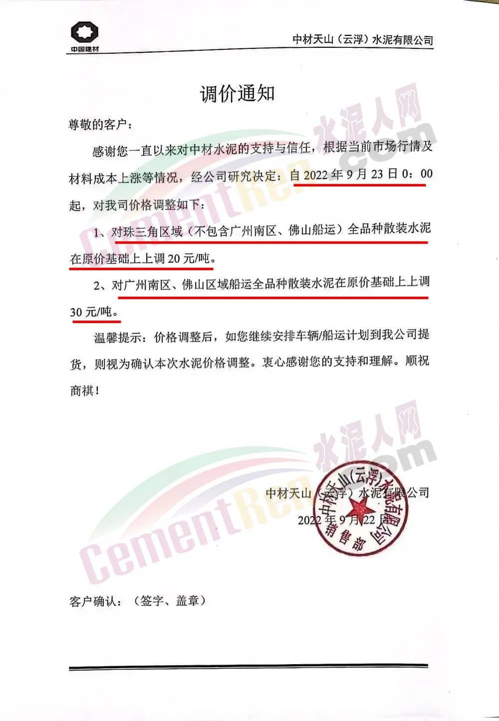 中材天山(云浮)水泥有限公司、中材天山(珠海)水泥有限公司等通知,自9月23日0時起對珠三角區域不包括廣州南區和佛山船運,全品種散裝水泥在原價基礎上上調20元/噸。對廣州南區、佛山區域船運全品種散裝水泥上調30元/噸。