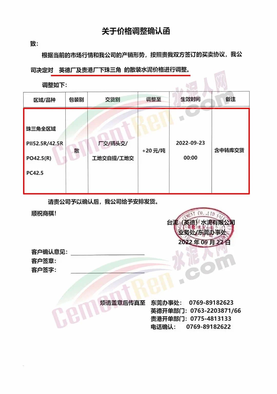 臺泥(英德)水泥有限公司通知,自9月23日0時,對英德廠及貴港廠下珠三角的散裝水泥價格上調20元/噸。