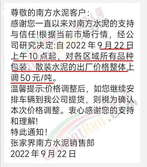 張家界南方水泥銷售部通知,經公司研究決定自2022年9月22日上午10點起,對各區域所有品種包裝、散裝水泥的出廠價格整體上調50元/噸。