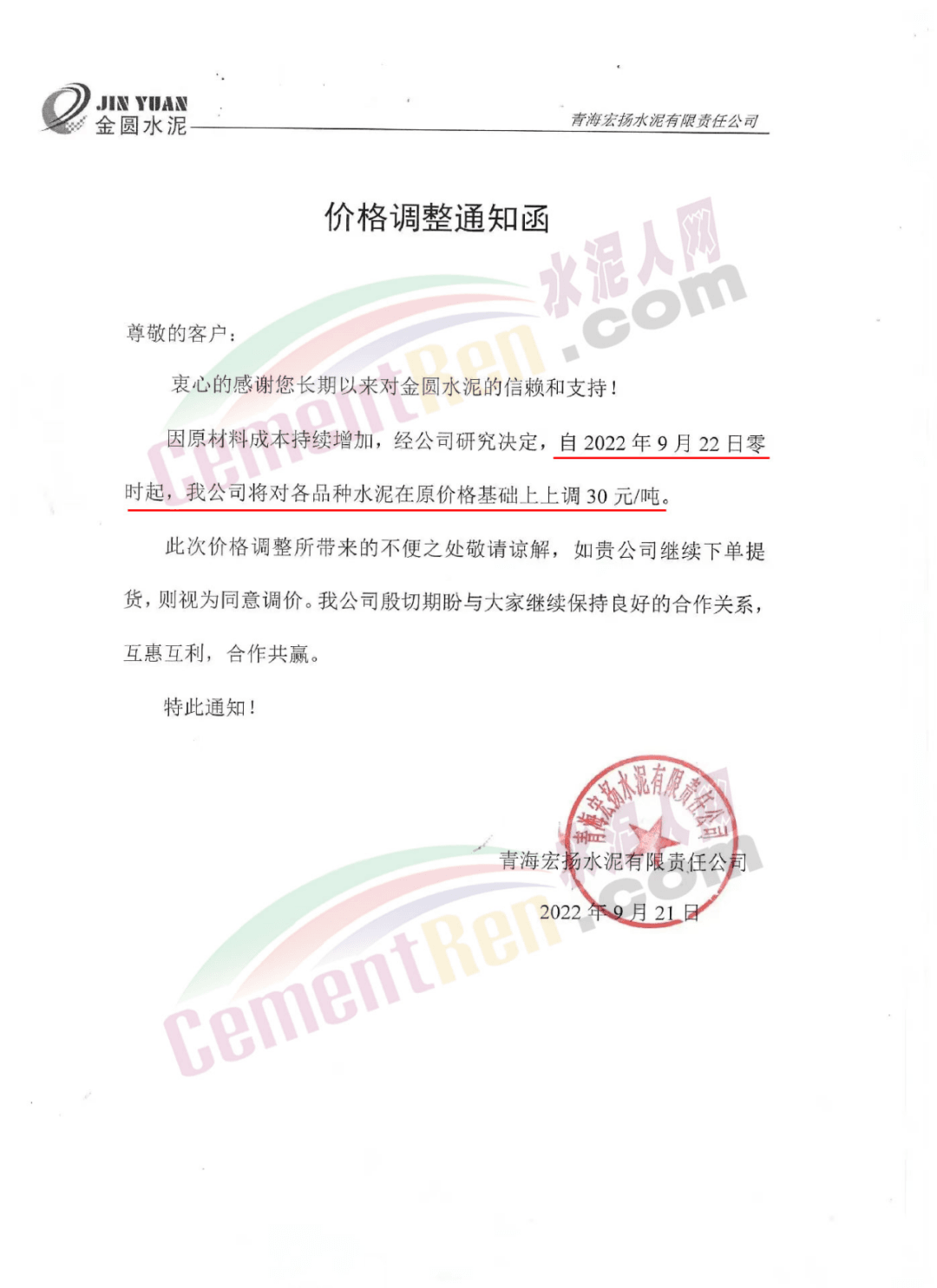 青海宏揚水泥有限責任公司通知,因原材料成本持續增加,經公司研究決定自9月22日零時起,公司將對各品種水泥在原價基礎上上調30元/噸。據水泥人網了解,這是該企業本月內第二次上調水泥價格,兩次累計上調50元/噸。