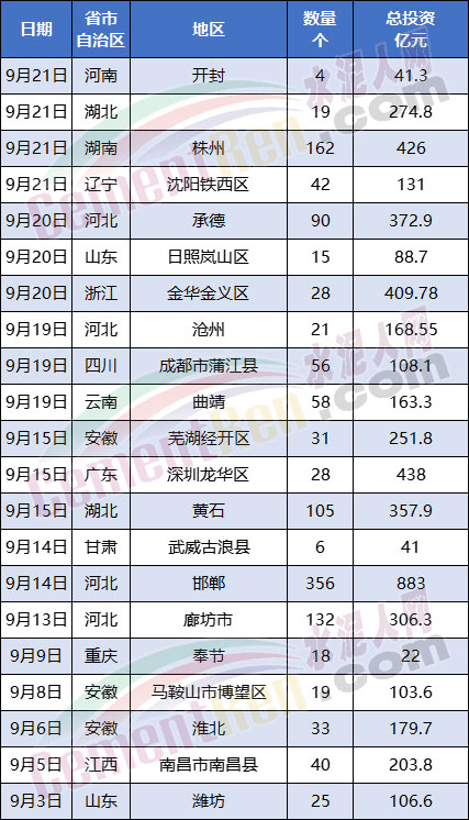 據水泥人網不完全統計,9月5日至今,浙江、安徽、河北、河南、遼寧、山東、廣東、湖北、湖南、江西、四川、重慶、云南、甘肅等14個省市自治區,新開工重點項目共1288個,總投資合計5078.13億元。