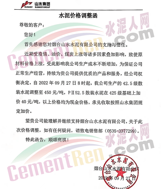 煙臺山水水泥有限公司發布通知稱:近期受疫情、油價、煤炭上漲等諸多因素疊加影響,致原材料價格上漲,受此影響,我公司生產成本不斷增加,為保證公司正常生產經營,經公司權衡決定,自2022年9月27日8時起,我公司生產的42.5級散裝水泥調至450元/噸,PII52.5散裝水泥在425級基礎上加價40元/噸。