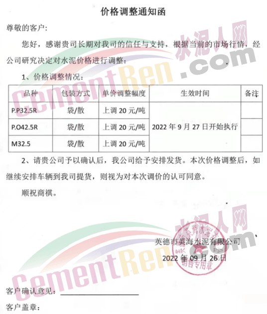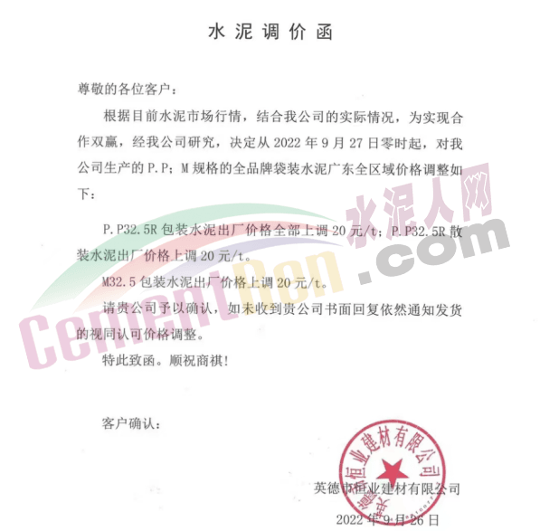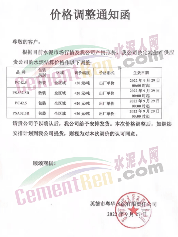 英德市恒業建材有限公司發布通知稱:自2022年9月27日零時起,我公司生產的P.P32.5R包裝水泥出廠價格上調20元/噸;P.P32.5R散裝水泥出廠價格上調20元/噸; M32.5包裝水泥出廠價格上調20元/噸。