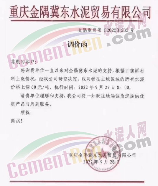 重慶金隅冀東水泥貿易有限公司發布通知稱:根據目前原材料上漲情況,自2022年9月27日8時起,我司銷往主城區的所有水泥價格上調60元/噸。