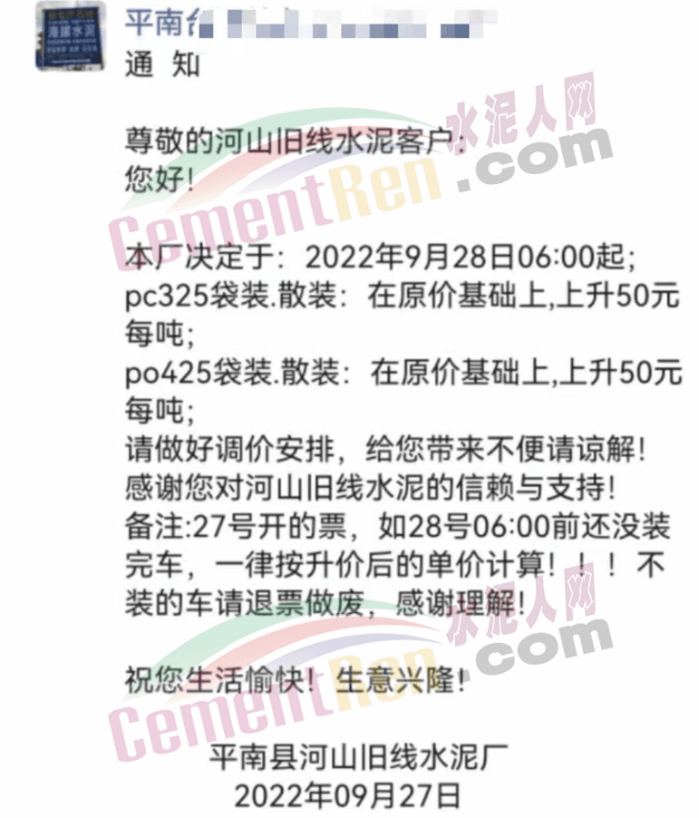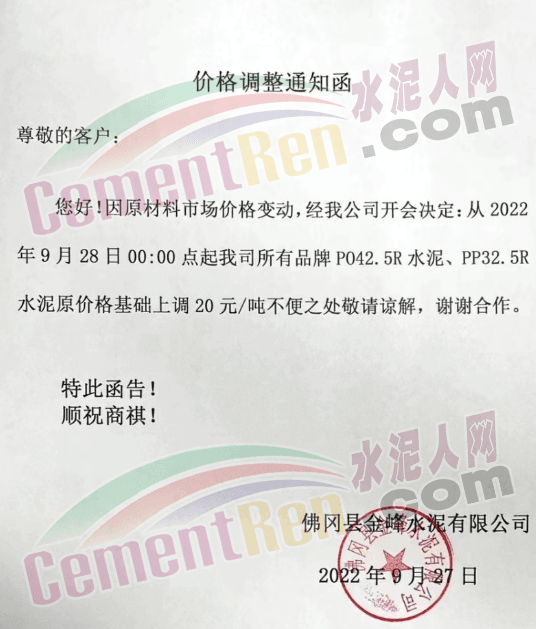 佛岡縣金峰水泥有限公司發布通知稱:因原材料市場價格變動,從2022年9月28日00:00起,我司所有品牌PO42.5R水泥、PP32.5R水泥原價格基礎上上調20元/噸。