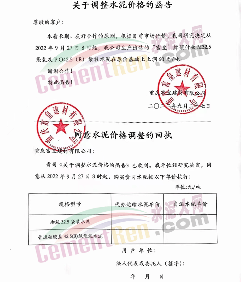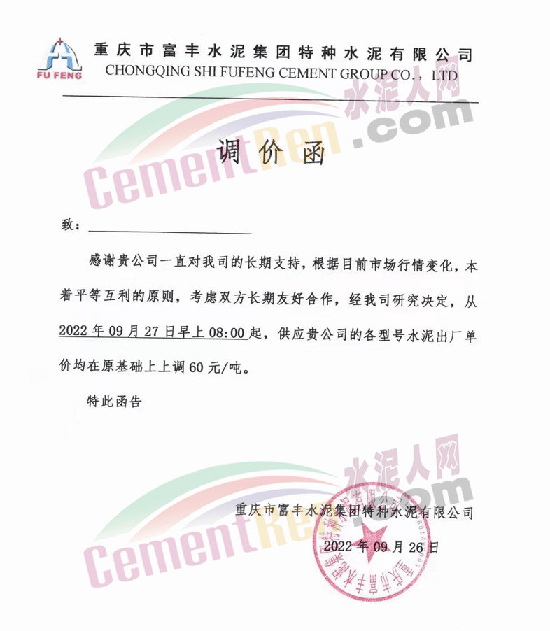 重慶市富豐水泥集團特種水泥有限公司發布通知稱:根據目前市場行情變化,經我司研究決定,從2022年9月27日早上8:00起,供應貴公司各型號水泥出廠價格在原基礎上上調60元/噸。