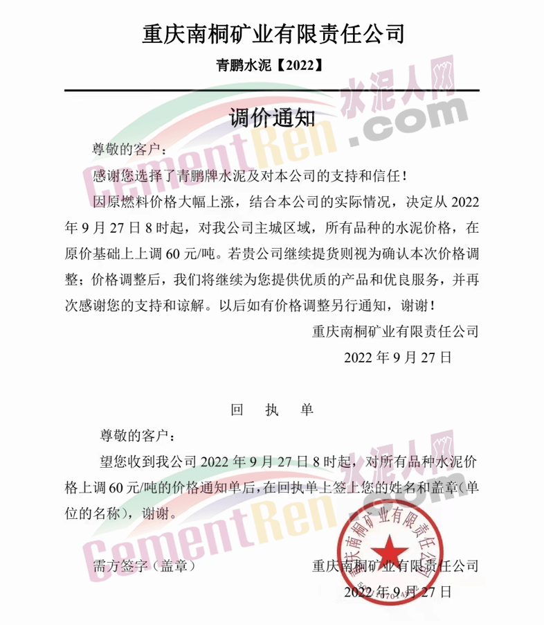 重慶南桐礦業有限責任公司發布通知稱:因原燃料價格大幅度上漲,結合本公司的實際情況,決定從2022年9月27日8時起,對我公司主城區域,所有品種的水泥價格,在原價格基礎上上調60元/噸。
