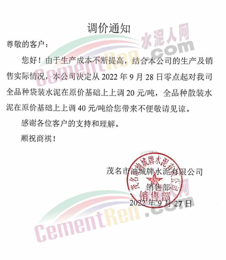茂名市油城牌水泥有限公司發布通知稱:本公司決定從2022年9月28日零點起對我司全品種袋裝水泥在原價基礎上上調20元/噸,全品種散裝水泥在原價基礎上上調40元/噸。