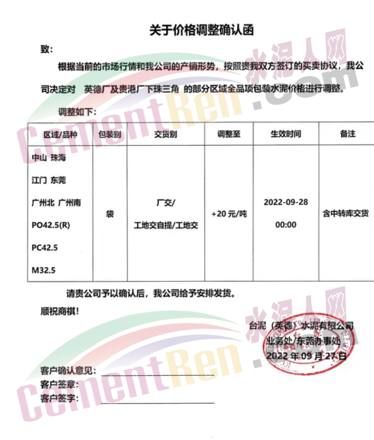 臺泥(英德)水泥有限公司發布通知稱:自2022年9月28日0時起,銷往中山、珠海、江門、東莞、廣州北、廣州南PO42.5R、PC42.5、M32.5袋裝水泥價格上調20元/噸。