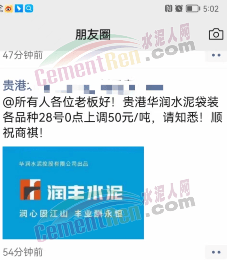 貴港華潤水泥袋裝各品種水泥28號0點上調50元/噸。