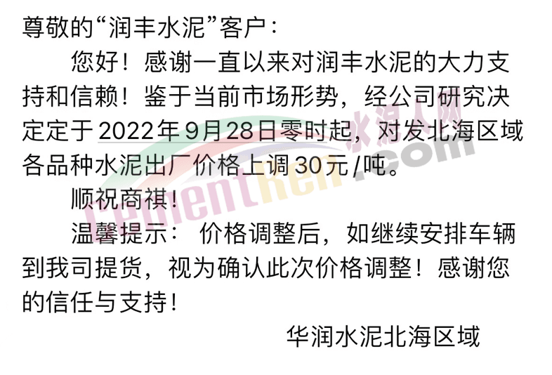 華潤水泥北海區域發布通知稱:自2022年9月28日零時起,對發北海區域各品種水泥出廠價格上調30元/噸。