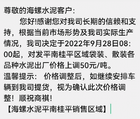 海螺水泥經銷商打款群里通知調價的信息是在8點17分,通知是自8點起上調40-50元/噸。前一日司機群里的通知是“25日8時上調50元/噸,后經研討決定,改為26日8點各品種上調30元/噸。”