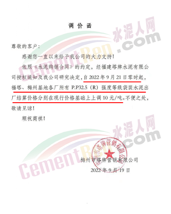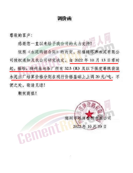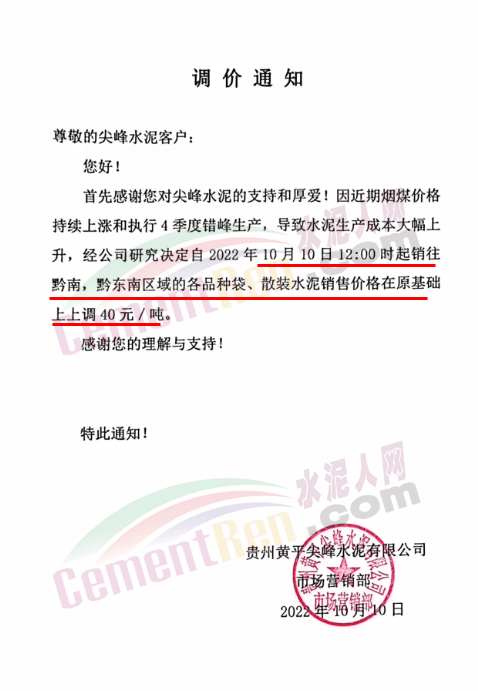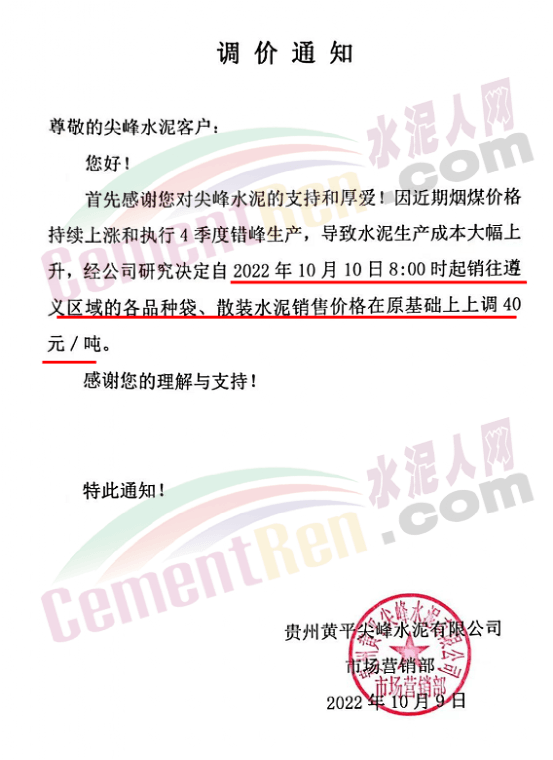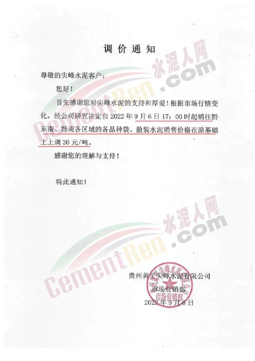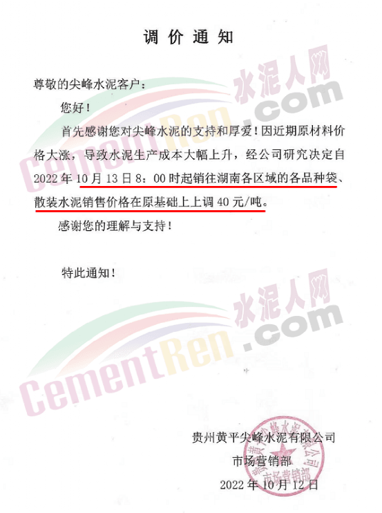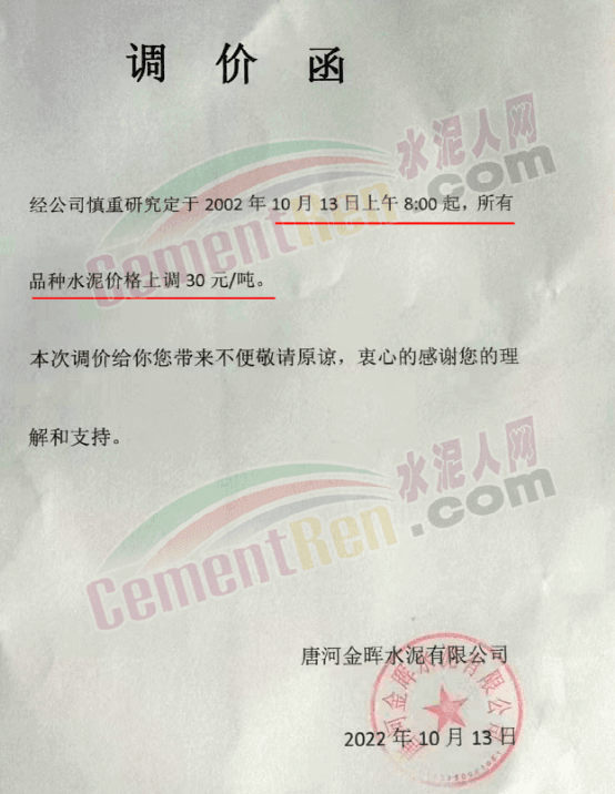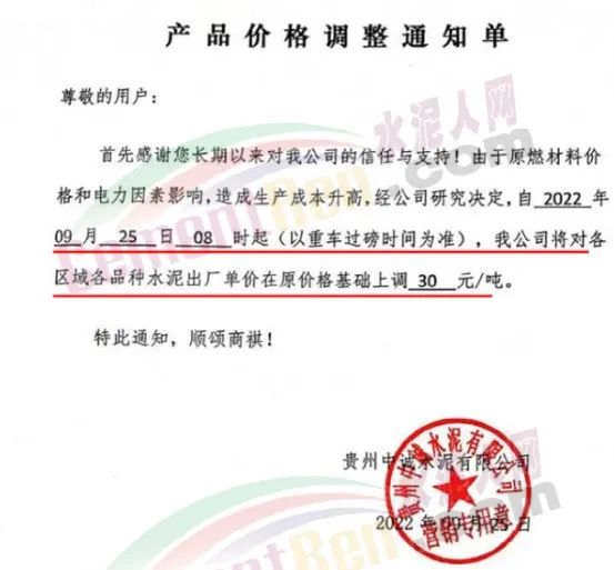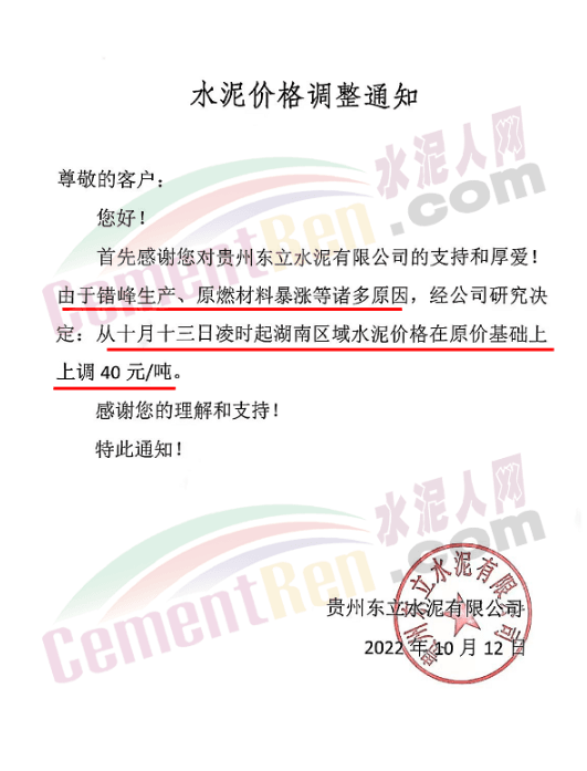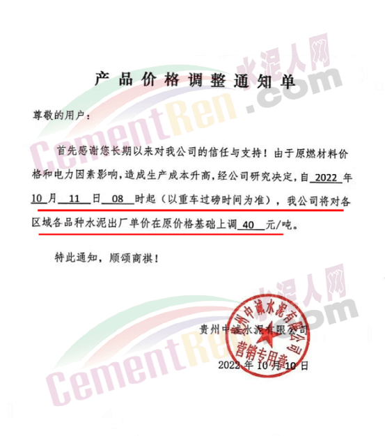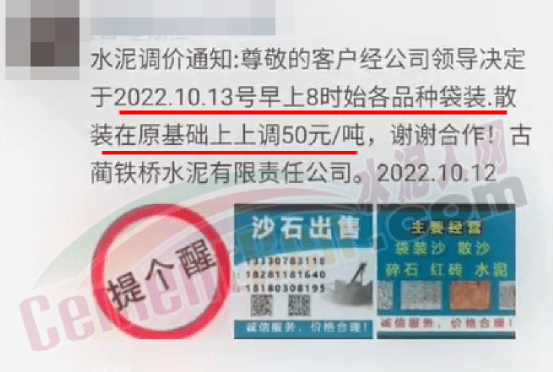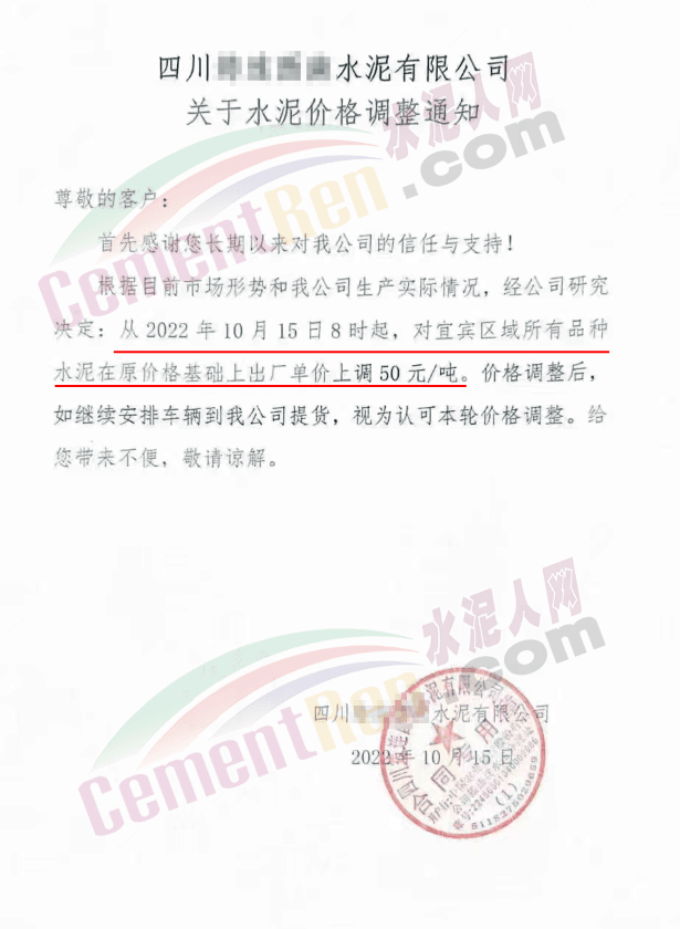 日前,四川某水泥企業通知自10月15日8時起,對宜區域所有品種水泥價格上調50元/噸,價格調整后,如繼續安排車輛到公司提供,則視為認可本輪價格調整。