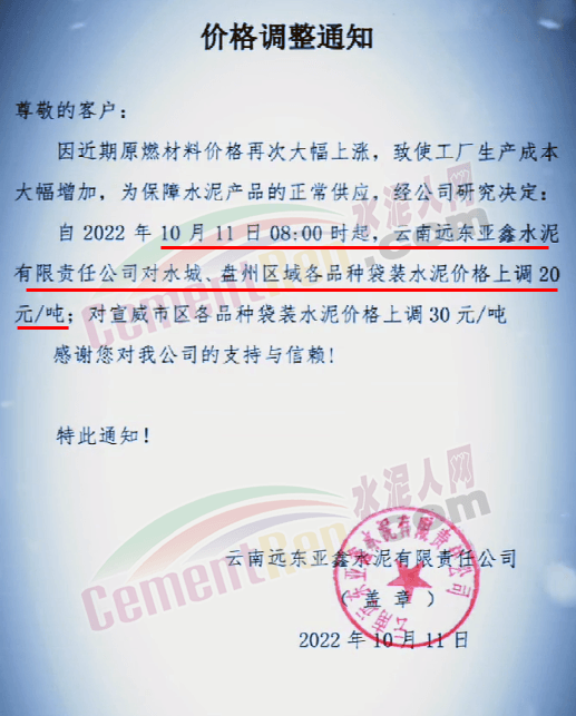 云南遠東亞鑫水泥通知10月11日8時起,對貴州水城、盤州區域各品種袋裝水泥價格上調20元/噸,對宣威市各品種袋裝水泥上調30元/噸。