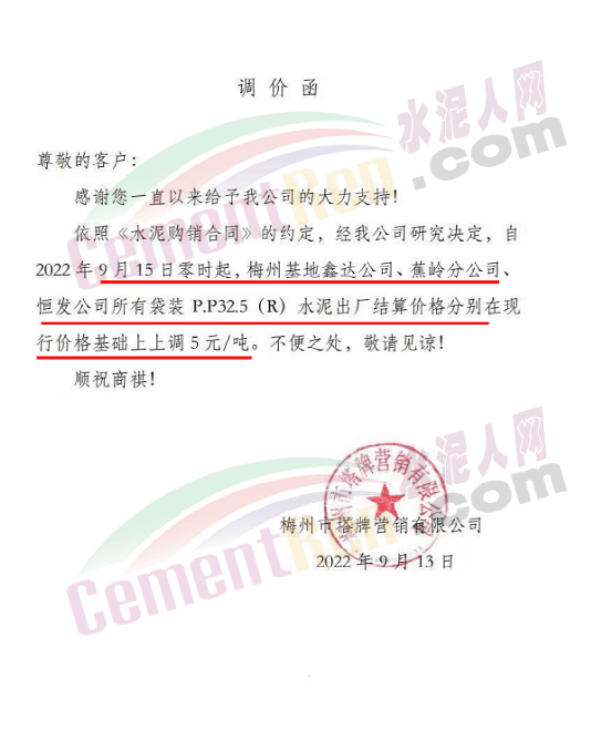 廣東梅州市塔牌營銷有限公司分別于9月15日、9月21日、10月13日上調袋裝P.P32.5(R)水泥出廠價5元/噸、10元/噸、20元/噸,三次累計上調35元/噸。