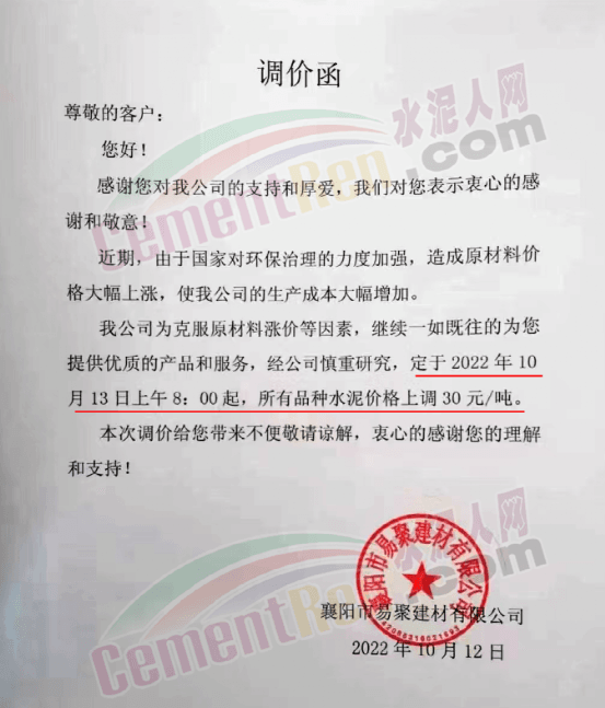 襄陽市易聚建材有限公司通知,為克服原材料漲價等因素,定于10月13日上午8時上午8時所有品種水泥上調30元/噸。