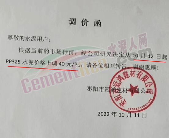 棗陽市冠鴻建材有限公司通知10月12日起PP32.5水泥上調40元/噸。