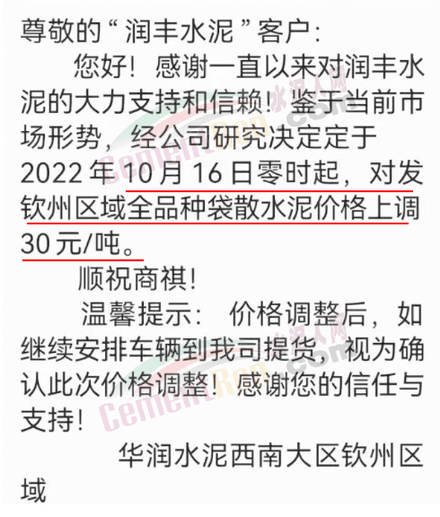 華潤水泥北海區域通知10月17日零時起,對發北海區域各品種水泥出廠價格上調30元/噸。