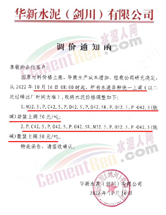 湖北華新水泥(宜昌)有限公司通知10月16日17時起,各標號水泥上調50元/噸。