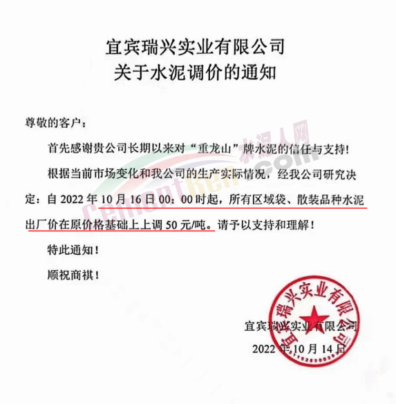 宜賓瑞興實業有限公司通知10月16日0時起,所有區域袋、散品種水泥上調50元/噸。