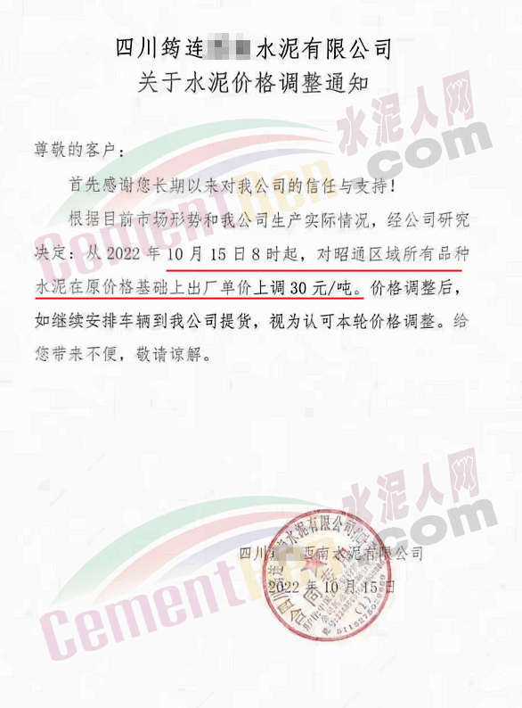 同期,四川宜賓筠連縣某品牌水泥企業通知,自15日8時起,對云南昭通區域所有品種水泥在原價基礎上上調30元/噸。