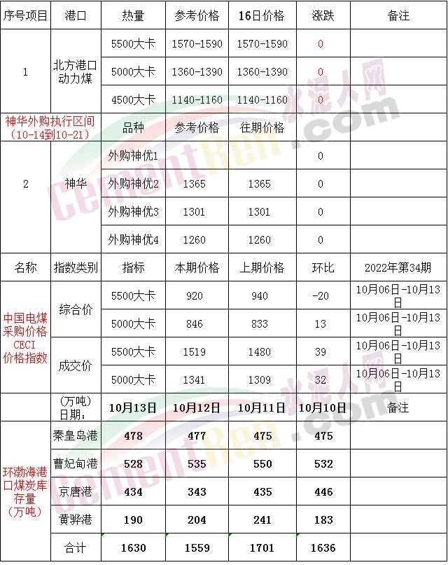 國家統計局10月14日發布的2022年10月上旬流通領域重要生產資料市場價格變動情況顯示,4500~5800大卡煤炭價格仍處于上行通道,其中5800大卡、5500大卡煤價均超過1500元/噸,而上年同期各規格煤價均在1500元/噸以下。
