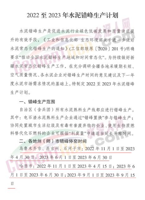 新疆維吾爾自治區發《關于下達2022至2023年水泥錯峰生產計劃的通知》稱,為持續做好新疆水泥常態化錯峰生產工作,在充分調研全疆各地采暖期長短、空氣質量情況、各水泥企業對錯峰生產時間的意見建議及下一年度水泥市場需求情況的基礎上,特制定2022至2023年水泥錯峰生產計劃。