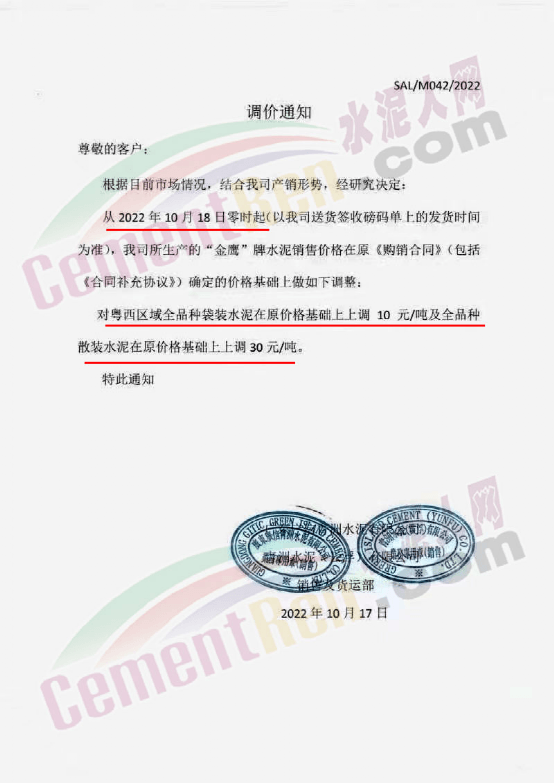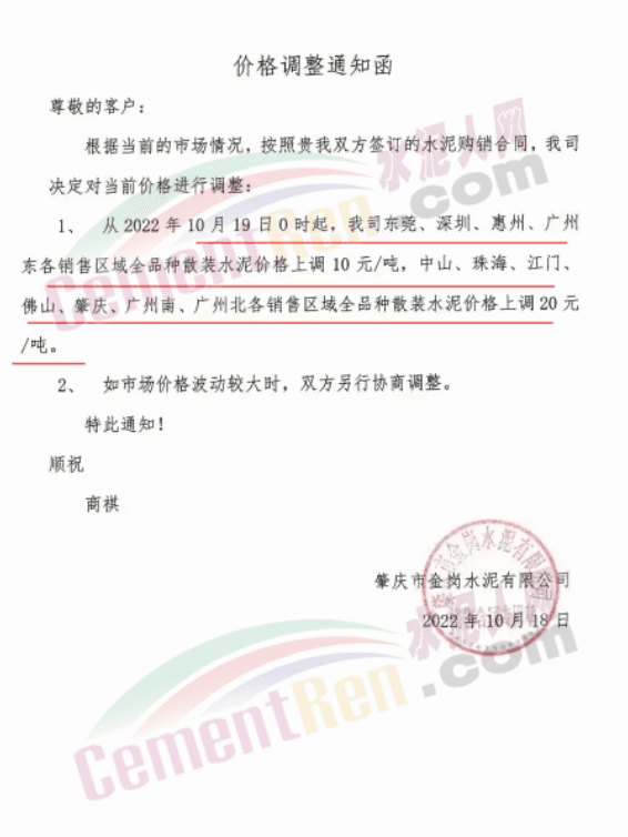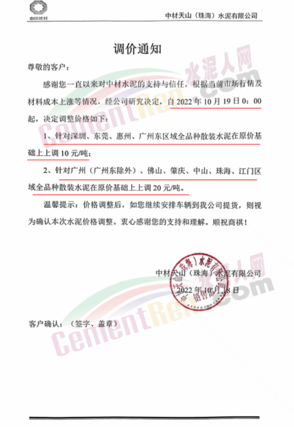 與此同時,珠三角區域中材天山、中材亨達、華潤水泥、臺泥水泥、塔 牌水泥、光大水泥、青洲水泥等水泥企業通知上調水泥價格10-30元/噸,下游商混企業紛紛跟進。