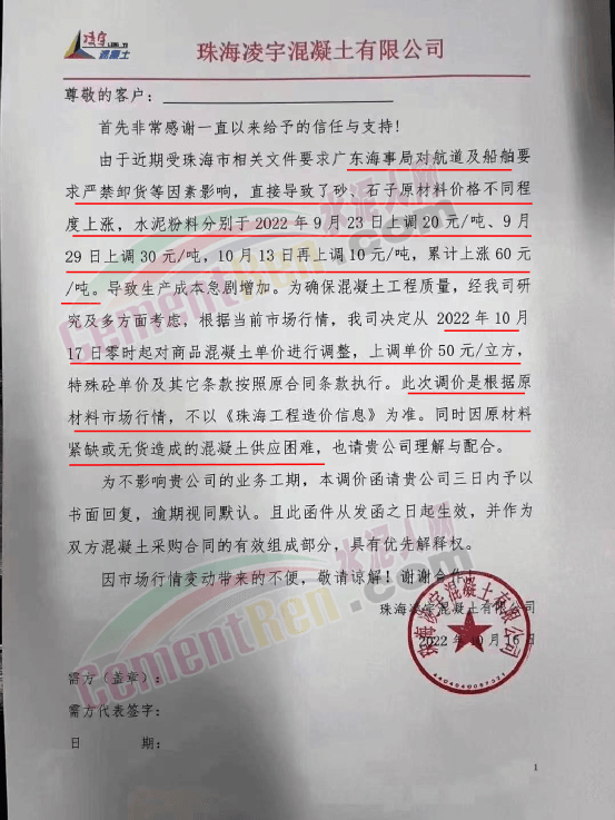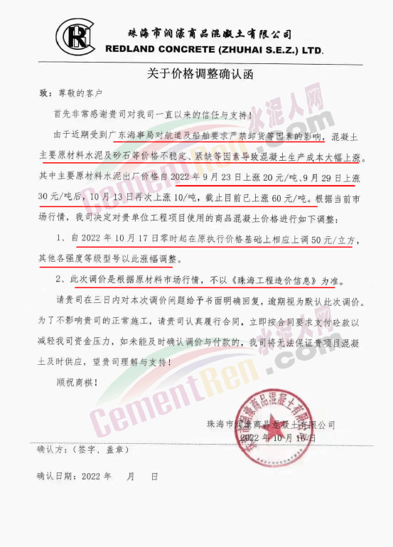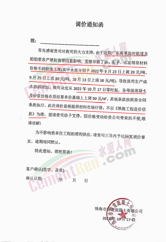 珠海三潤混凝土有限公司、珠海文冠商品混凝土有限公司、珠海市志隆商品混凝土有限公司、珠海市潤濠商品混凝土有限公司、廣東中聯新材料科技有限公司、珠海市錦龍混凝土有限公司、珠海凌宇混凝土有限公司等近十家混凝土企業通知稱,由于廣東海事局對航道及船舶要求嚴禁卸貨等因素影響,直接導致了砂、石子、水泥等原材料價格不同程度上漲。其中水泥分別于2022年9月23日上調20元/噸,9月29日上調30元/噸,10月13日上調10元/噸,累計上調60元/噸,導致了混凝土生產成本急劇增加。為確保建筑工程混凝土質量不受影響,混凝土公司決定各項目各等級混凝土及砂漿價格在原結算單價基礎上上調50元/m³。且強調此次調價是根據原材料市場行情,不以《珠海工程造價信息》為準。同時提到,因原材料緊缺或無貨造成的混凝土供應困難,也請客戶理解、支持與配合。