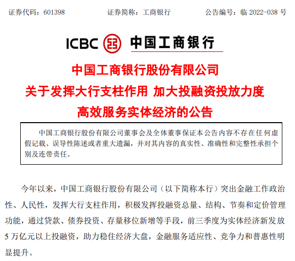 16日晚間,工、農、中、建、交五大國有銀行均發布公告,表示加強對實體經濟的支持力度。