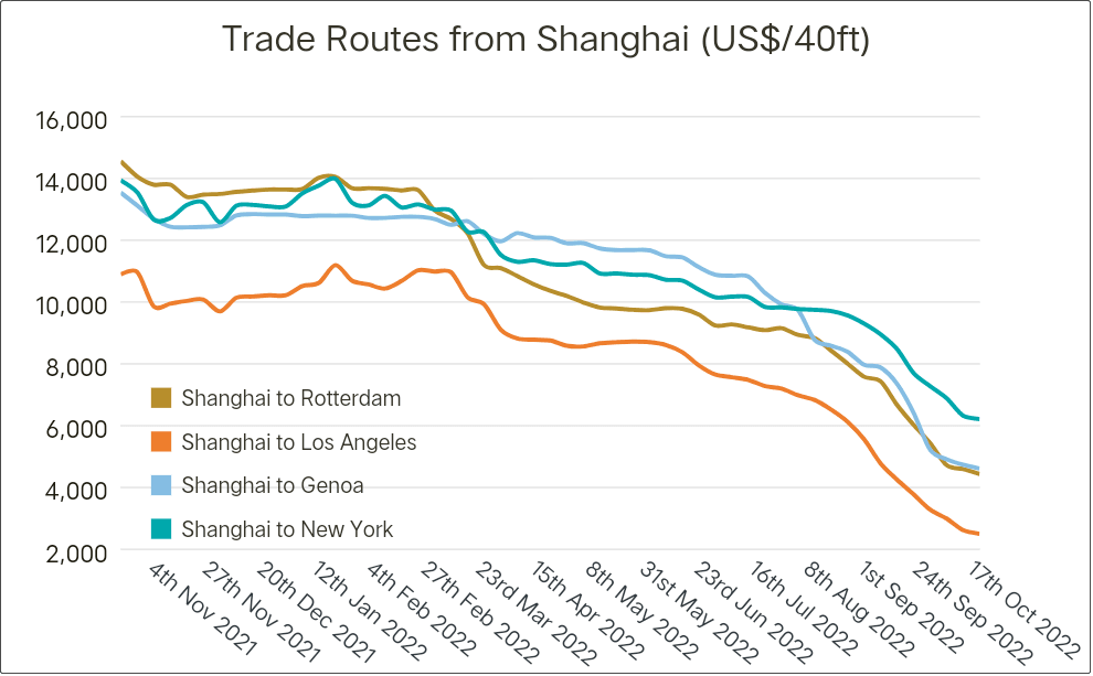 國際航運市場,從去年的一船難求到如今的無人問津可見一斑,近日,上海至洛杉磯集裝箱指數正在斷崖式下跌;上海發往歐洲路特丹港的集裝箱指數也在急劇下跌;上海發往意大利熱那亞的集裝箱指數也難以幸免。這三個數據很明確的說明中國在太平洋、印度洋和大西洋的航運指數正在急劇下降。