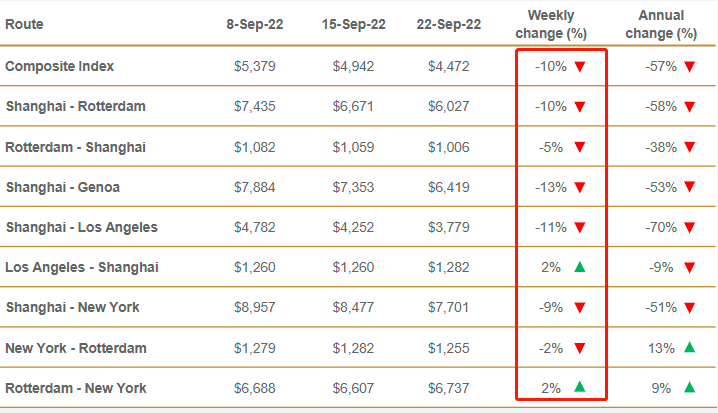 德路里的世界集裝箱運價指數(WCI)已連續30周下降,較去年同期下跌57%。上海-熱那亞的運費下跌13%至6419美元/FEU;上海-洛杉磯的運費下跌11%至3779美元/FEU;上海-鹿特丹和上海-紐約的運費分別下降10%和9%至6027美元/FEU和7701美元/FEU。