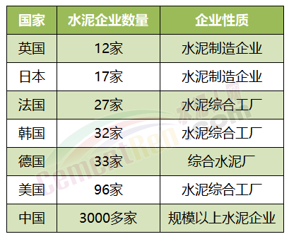 產能利用率方面,今年三季度,全國工業產能利用率為75.6%。就水泥行業而言,北方水泥企業由于季節原因和前述政策性原因,產能利用率明顯低于南方水泥企業。但是隨著下游市場低迷態勢持續南北方的差距或將縮小。對比國際發達國家擁有的水泥企業數量可見,未來或將是“巨頭企業”的天下。