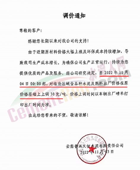 水泥人網消息:云南普洱天恒水泥有限責任公司通知由于近期原材料價格大幅上漲及環保成本持續增加,導致公司生產成本增長。為確保公司生產正常運行,經公司研究決定,自2022年11月4日0時起,對臨滄區域全品種水泥及熟料出廠價格在原價格基礎上上調30元/噸,價格上調時間以車輛出廠磅單打印出廠時間為準。
