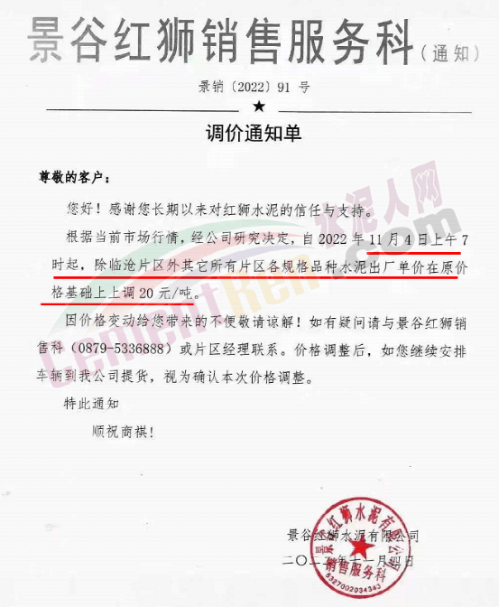 11月4日,景谷紅獅水泥通知,根據當前市場行情 ,經公司研究決定自11月4日上午7時起,除臨滄片區外其他片區各規格品種水泥出廠單價在原價基礎上上調20元/噸。