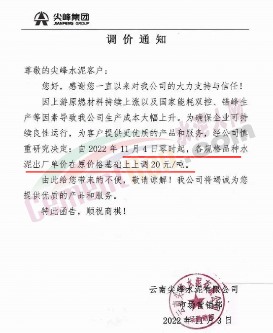 11月3日云南尖峰水泥有限公司市場營銷部通知,因上游原燃材料持續上漲以及國家能耗雙控、錯峰生產等因素導致公司生產成本大幅上升。為確保企業可持續良性運行,為客戶提供更優質的產品和服務,經公司慎重研究決定自2022年11月4日零時起,各規格品種水泥出廠單價在原價格基礎上上調20元/噸。