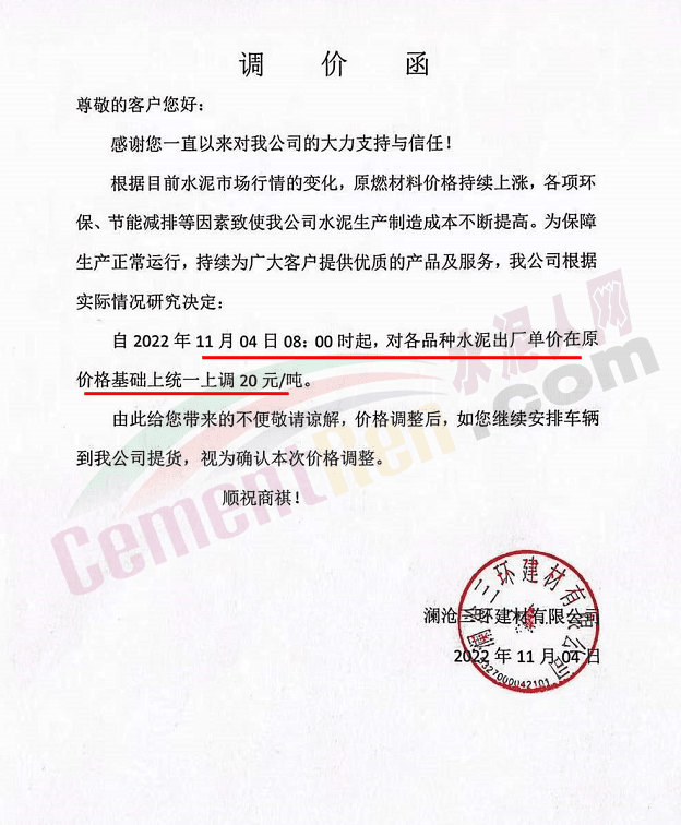 云南瀾滄三環建材有限公司通知,根據目前水泥市場行情的變化,原燃材料價格持續上漲,各項環保、節能減排等因素致使公司水泥生產制造成本不斷提高。公司根據實際情況研究決定自11月4日8時起,對各品種水泥出廠價在原價基礎上統一上調20元/噸。