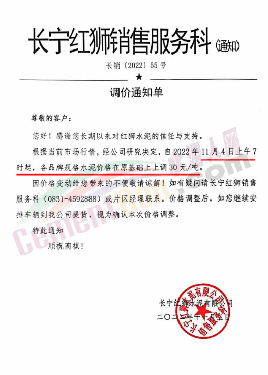 長寧紅獅銷售服務科通知,根據當前市場行情,經公司研究決定,自2022年11月4日上午7 時起,各品牌規格水泥價格在原基礎上上調30元/噸。